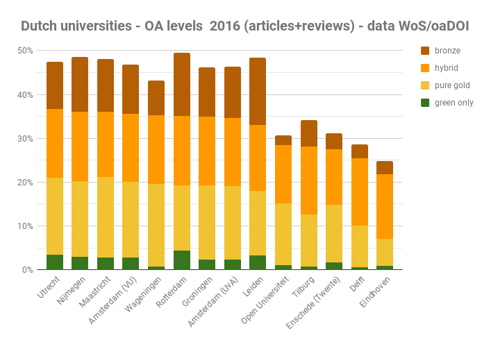 Two employees of Utrecht University Library, Jeroen Bosman and Bianca Kramer, have measured how many articles and reviews of researchers from Dutch universities have been published open access. They used the new available open access data from Web of Science and the online tool oaDOI. The results have been published as preprint in PeerJPreprints as part of a broader study. All used data are available via Zenodo. The data is available per university and the outcomes for 2016 provide insight into current developments.