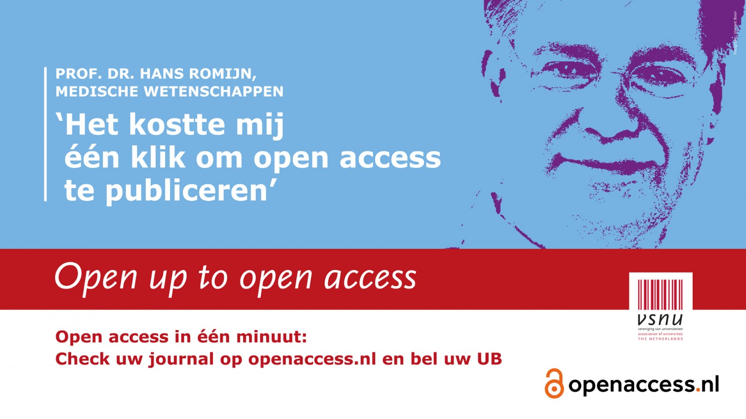 De Vereniging van Nederlandse Universiteiten (VSNU) heeft het initiatief genomen voor een publicatiecampagne over open access. De campagne richt zich op de Nederlandse onderzoekers. In 2020 moeten alle publicaties van Nederlandse wetenschappers in open access beschikbaar zijn. Een aantal promovendi en gerenommeerde wetenschappers van Nederlandse universiteiten hebben aan de campagne meegewerkt. Zij staan afgebeeld op de posters en banners die vanaf openaccess.nl gedownload kunnen worden onder het tabje ‘Meer weten’ – ‘Promotiemiddelen’.